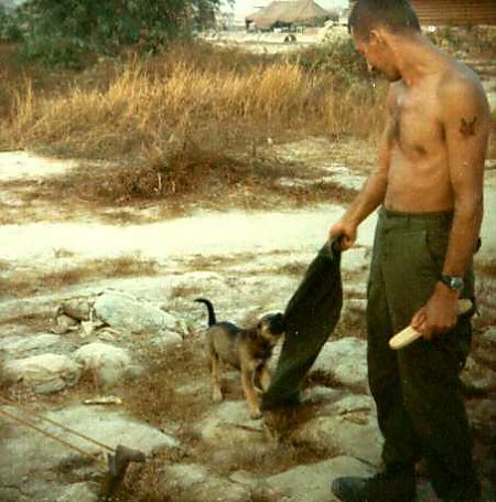 | SSG. Ted Kirmse with our mascot Viet dog." | |